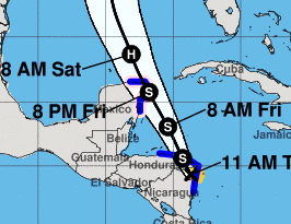 The Government of Mexico has issued a tropical storm warning for the coast of the Yucatan Peninsula and the adjacent islands from Punta Herrero to Rio Lagartos. A hurricane watch is in effect for the same stretch of coastline.