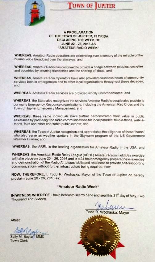 Echoing the state proclamation, some individual Florida communities released their own statements of recognition for Amateur Radio. The Town of Jupiter declared June 22-26 as “Amateur Radio Week.” A proclamation signed by Mayor Todd Wodraska pointed out the State’s recognition of Amateur Radio’s communication support in emergencies and public service events. City of Lake Worth Mayor Pam Triolo also declared June 20-26 as “Amateur Radio Week, in recognition of Amateur Radio’s role in emergency and public service communication, and points to Field Day as a 24-hour emergency preparedness exercise and demonstration of skills and readiness to provide self-supporting communications without further infrastructure. The City of Palm Beach Gardens, in a proclamation signed by Mayor Marcie Tinsley, also declared June 20-26 as Amateur Radio Week,” noting that radio amateurs are celebrating more than a century “of the miracle of the human voice broadcast over the airwaves.”