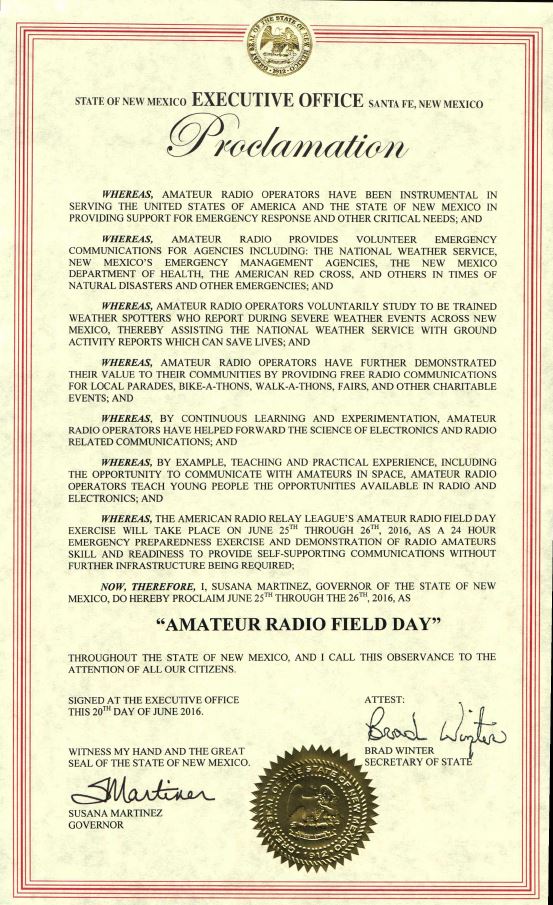 New Mexico Gov Susana Martinez recognized June 25-26 as “Amateur Radio Field Day.” Her proclamation cited Amateur Radio’s role in emergency and public service communication. “By continuous learning and experimentation, Amateur Radio operators have helped forward the science of electronics and radio-related communications,” the proclamation said, “and, by example, teaching and practical experience, including the opportunity to communicate with amateurs in space…”