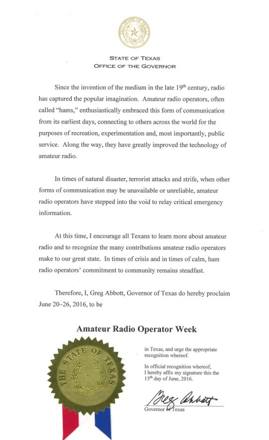 Texas Gov Greg Abbott proclaimed June 20-26 as “Amateur Radio Operator Week” in the Lone Star State. “I encourage all Texans to learn more about Amateur Radio and to recognize the many contributions Amateur Radio operators make to our great state,” Abbott said. “In times of crisis and in times of calm, ham radio operators’ commitment to community remains steadfast.”