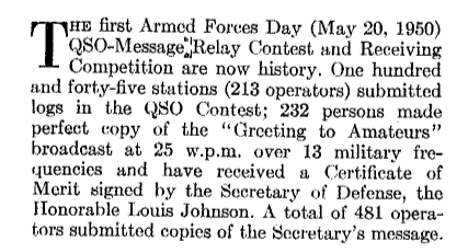 ARRL The National Association for Amateur Radio® has promoted the participation of military and amateur radio stations in the AFD event for more than 50 years. In the August 1950 issue of ARRL's membership journal, QST, it was noted that "232 persons made perfect copy of the 'Greeting to Amateurs' broadcast at 25 w.p.m. over 13 military frequencies and have received a Certificate of Merit signed by the Secretary of Defense, the Honorable Louis Johnson."