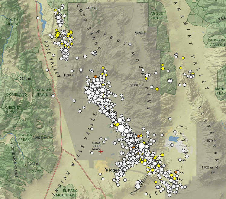 Everyone’s worst fears were realized the next day — Friday, July 5 — when a 7.1 magnitude earthquake struck in the early evening. This was followed over the next 2 hours by 19 aftershocks, ranging in magnitude from 4.5 to 5.5. The epicenter of the 7.1 temblor was some 11 miles north of Ridgecrest in Indian Wells Valley, within the boundaries of the China Lake Naval Air Weapons Station (NAWS).