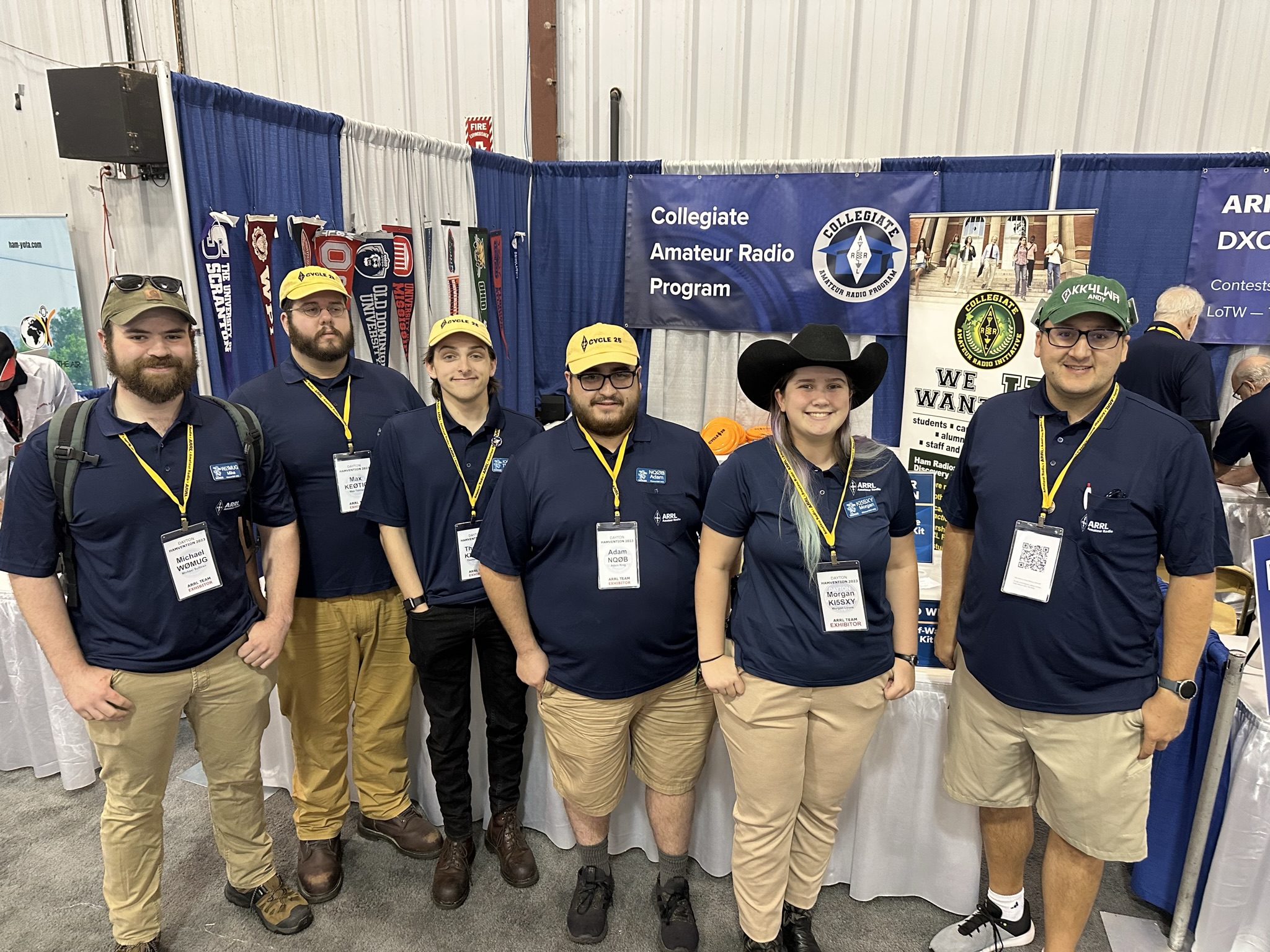 The first official day of 2023 Dayton Hamvention® began with half an hour of calm on the show floor. All the transceivers and whips, the coils of coax, and bins of SMA connecters lay abed beneath their evening coverings -- white plastic tablecloth in the ARRL exhibit space, black canvas covers for neighboring Icom, and others beyond that. Almost quiet beneath the Tesla building’s steep-pitched ceiling, exhibitors shuffled in and peeled back coverings to bare their wares. Bob Inderbitzen, NQ1R, Director of Marketing and Innovation at ARRL, took to the center of the ARRL exhibits and raised his arms. “Attention ARRL team! Everybody gather ’round. Time for the team photo.”