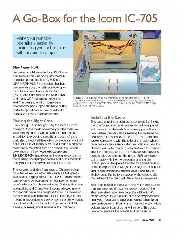 The winning article for the June 2022 QST Cover Plaque award is “A Go-Box for the Icom IC-705,” by Dino Papas, KLØS.