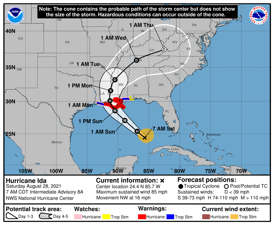 As of 1200 UTC on Saturday, Ida was some 440 south-southeast of New Orleans, with maximum sustained winds of 85 MPH — Category 1 — moving to the northwest at 16 MPH. The NHC says Ida is expected to rapidly intensify as it moves over the southeastern and central Gulf of Mexico through Saturday night. “Ida is expected to be an extremely dangerous major hurricane when it approaches the northern Gulf coast on Sunday,” the NHC forecast says. Given the abundance of warm water in the Gulf, Ida could become a Category 3 or even a Category 4 hurricane with winds of 120 to 140 MPH with higher gusts, according to some predictions.