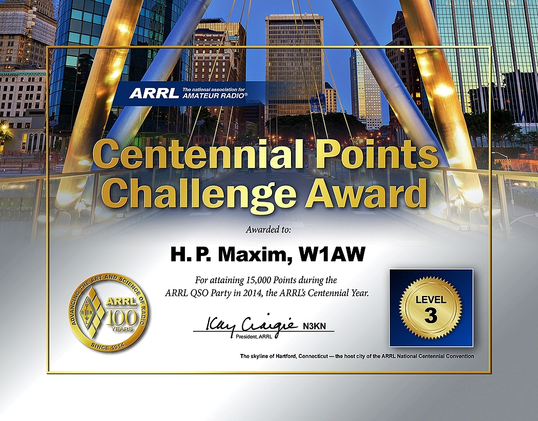 Certificates will be available for the Centennial Points Challenge Award, while W1AW WAS Award participants can order a certificate, a plaque, or both -- ordered separately on the website. Certificates are $16, and plaques are $60.