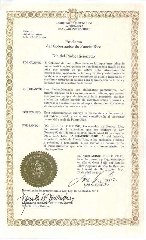 That same day -- at a ceremony recognizing a number of voluntary organizations in the headquarters of the Puerto Rico Emergency Management Agency (AEMEAD) -- AEMEAD Executive Director Heriberto Saurí presented the proclamation celebrating Puerto Rico Amateur Radio Operator Day, signed by the Governor of Puerto Rico Luis G. Fortuño. Carlos Rosado, KP4CAR, accepted the proclamation on behalf of all radio amateurs in Puerto Rico, and especially on behalf of the Amateur Radio Volunteer Corps of Puerto Rico (CVRPR), who work closely with the agency in both drills and emergency situations.