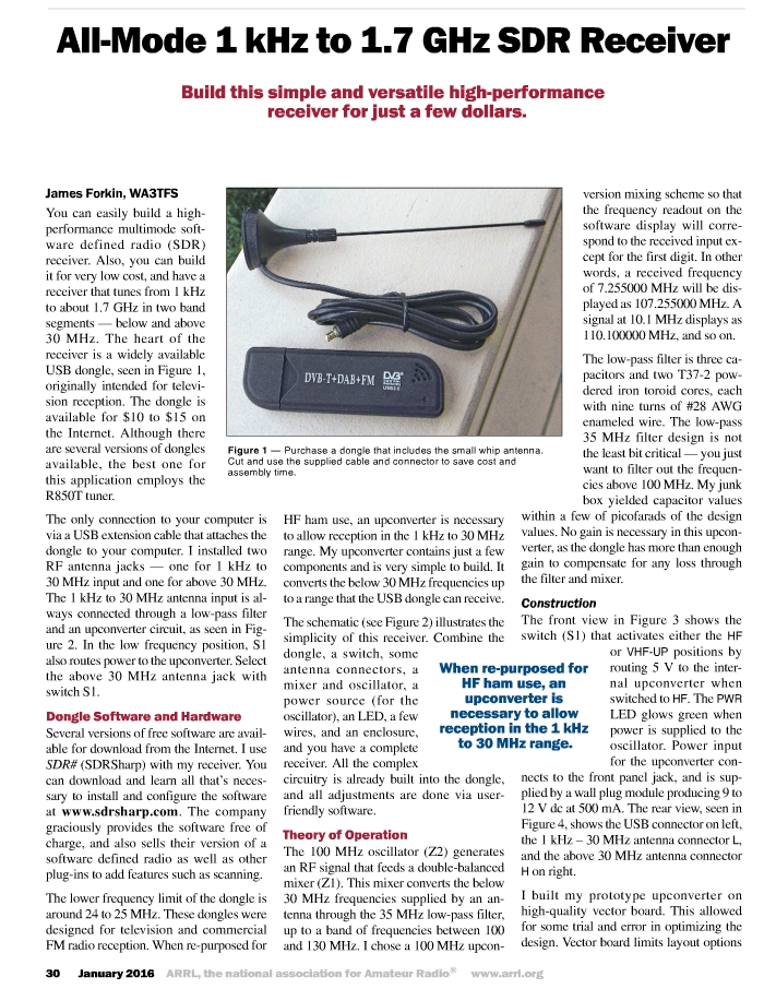 The winner of the January 2016 QST Cover Plaque award is All-Mode 1 kHz to 1.7 GHz SDR Receiver” by James Forkin, WA3TFS.